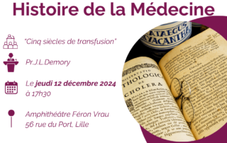 Conférence Histoire De La Médecine L’association des anciens de la Faculté de Médecine, Maïeutique, Sciences de la Santé (FMMS) vous propose d’assister à la conférence ” Histoire de la Médecine : Cinq siècles de transfusion”. Celle-ci sera dispensée par le Pr J.L.Demory. Elle se déroulera le jeudi 12 décembre