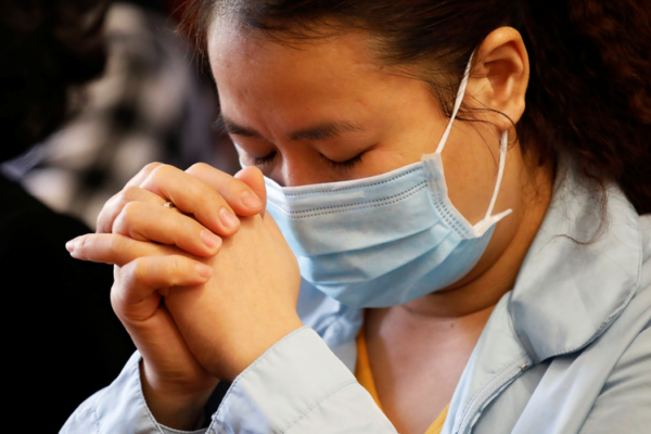 A woman wearing a mask prays during Ash Wednesday Mass at St. Joseph Cathedral in Hanoi, Vietnam, Feb. 26, 2020, amid the coronavirus outbreak. (CNS photo/Kham, Reuters)