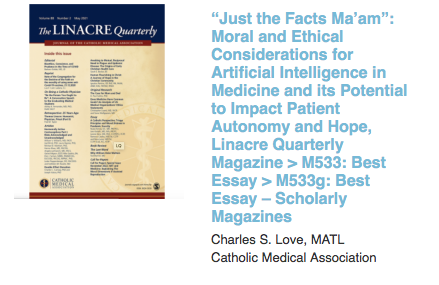 First Place (“Just the Facts Ma’am”: Moral and Ethical Considerations for Artificial Intelligence in Medicine and its Potential to Impact Patient Autonomy and Hope). Charles Love put the CMA ahead of the curve in looking at the theological and practical challenges of artificial Intelligence in medicine.