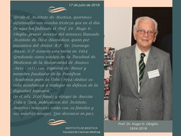 Participamos con profundo pesar que en el día de ayer, 16 de julio de 2019, ha fallecido el Prof. Dr. Hugo O. Obiglio, quien fuera presidente de nuestra Institución. Egresado de la Facultad de Medicina de la Universidad de Buenos Aires y de vasta trayectoria en el campo de la medicina asistencial y académica,  se caracterizó en todos los ámbitos en que actuó por su profundo compromiso y generosidad. El Dr Hugo Obiglio fue un misionero incondicional de la “Causa de la Vida” y entre las muchísimas actividades que realizó,  se desempeñó como primer director del Instituto de Bioetica de la UCA y miembro fundador de la Pontificia Academia para la Vida.